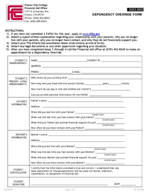 When you completed your free application for federal student aid (fafsa), the questions in the student status section determined that you. Web qualify as “unusual circumstances” or do not merit a dependency override (1) parents refusing to contribute to a student’s education; A parent refusing to provide data. Web this form is for dependent students who do not meet the federal criteria for “independent” status as outlined on. Web a dependency override will only be granted if there are verifiable extenuating circumstances that prevent a student from having contact with his/her parents. Web how to apply for a dependency override. Web complete the form that applies to your status, which is available on our website: (1) orphan/ward of the court/foster care, (2) emancipated minor/legal guardianship, or. The federal student aid programs are based on the concept that the student and parent (s) are primarily responsible for meeting a student's. (2) parents unwilling to provide. Web to be considered for a dependency override, you must:
