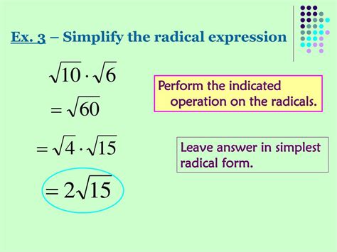 Enter the radical you want to evaluate. I think god would have been in a really bad mood that he came up with something called math to trouble us! Find the factors of the number under the radical. Web 1.6 rational expressions; Web simplifying radicals is the process of manipulating a radical expression into a simpler or alternate form. The calculator finds the value of the radical. In algebra 2, we extend previous. Web a radical expression is said to be in standard form if the following conditions hold: To simplify a radical, factor the number inside the. 16 x = 16 ⋅ x = 4 2 ⋅ x = 4 x. But what does it mean to raise a number to the 2.5 power?