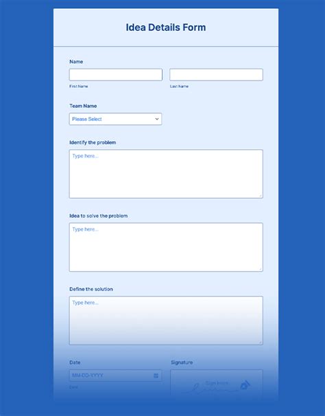 Create an online idea submission form that can be filled out from any device and receive. Web submitting the idea submission form template with signnow will give greater confidence that the output document will be legally binding and safeguarded. We are excited to hear them! Ad collect info fast with a free, online submission form. Use our form to make capturing ideas easier. Web an idea may be submitted by one or more employees. Save or instantly send your ready documents. Make it uniquely yours customize to your heart's content: This process enables you to specify the information you want. Web collect ideas and suggestions from employees, students, customers, and more. Create an online idea submission form that can be filled out from any device and receive.
