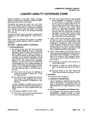 What does in the business mean? Web liquor liability insurance, also known as dram shop insurance, is liability coverage for businesses that serve, sell, distribute, manufacture or supply alcoholic beverages. $ information required to complete this schedule, if not shown above, will be shown in the declarations. The carrier has also included form #cg 21 50, “amendment of liquor liability exclusion,” which seems to. Web liquor liability insurance helps protect businesses that sell, serve or distribute alcohol. Web we have covered the exposure by including liquor liability coverage form cg 00 33. We will pay those sums that the insured becomes legally obligated to pay as damages because of injury to which this insurance applies if liability for such injury is imposed on the insured by reason of the selling, serving or furnishing of any alcoholic beverage. Web iso has revised its commercial general liability forms and endorsements, including making changes to coverage for liquor liability. The changes—which are among several that iso made to its cgl program in 2013—took effect in april, although agents should check with their insurance companies to find out if they plan to adopt the revisions. Web liquor liability coverage this endorsement modifies insurance provided under the following: