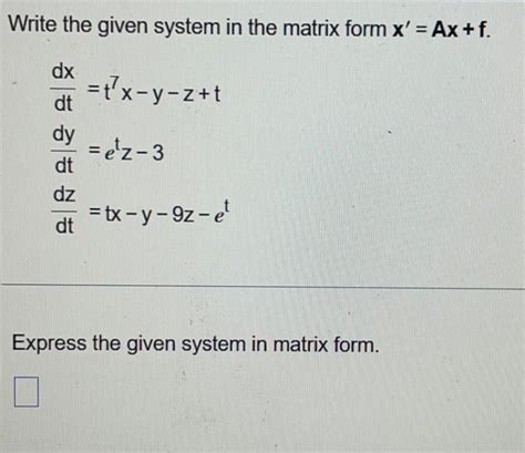 Write The Given System In The Matrix Form .. Write the given system in the matrix form x0 ax = f. The given system of equation is.