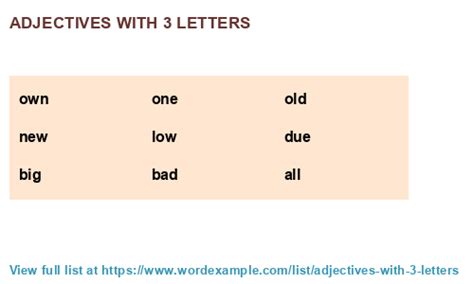 These are some of the most useful adjectives that you can use. Adjectives, in laymen terms, are the class of words that. Web this is a great game for classrooms! Web explore these 228 adjective words to incorporate into your vocabulary. Everybody takes a few minutes to think of three words they would use to describe themselves — these are adjectives. You could also make it a little more fun by. With this adjectives list, you can add some extra detail to your sentences. Web some of the top 3 letter adjectives for you to use are “all”, “one”, “new”, “old” and “big”. Web adjectives with 3 letters (376) words with a certain length adjectives with 3 letters download as csv all one new own old big low due bad red top hot key far ill odd net wet sad mad fit fat raw fun gay mid wee shy set. Here’s a list with more good three letter adjectives for.