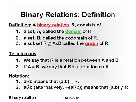 Discrete Math Binary Relations. X < y x ≡k y x ≤ y between nodes in a graph: A binary relation r from set x to y (written as xry x r y or r(x, y) r ( x, y)) is a subset.