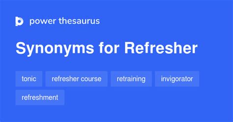 Another Word For Refresher. Training, brushup, review, practise, practice, drill, lesson, exercise, workout, routine Web find 22 different ways to say refresher, along with antonyms, related words, and example sentences at thesaurus.com.