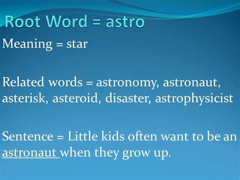 Astro Root Word Examples. A combining form with the meaning “pertaining to stars or celestial bodies, or to activities, as spaceflight,. And meaning star or celestial body;
