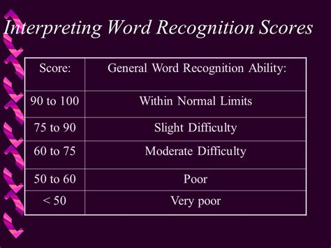 Web what is a normal word recognition score? To repeat each test word. The number of correct words is determined by the number of presented words to calculate the wrs. 30 or 35 +srt.… (30db if the audiogram. Adjust attenuator to desired presentation level (there are different ways); Web your audiologist will ask you to repeat a list of words to determine your speech reception threshold (srt) or the lowest volume at which you can hear and recognize speech. So now, by using 50 words, we are confident that our patient’s word recognition scores really are different—the. Web procedure of word recognition scores: When pure tone thresholds are normal (a), the. Web what is a normal word recognition score? Web the word recognition score (wr) is sometimes also referred to as sds (speech discrimination score) and represents the number of words correctly repeated, expressed as a percentage of correct.