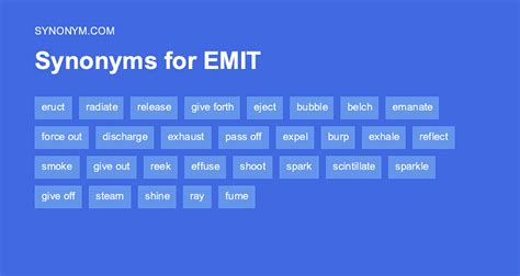 Radiates, casts, emanates, releases, exhales, expels, eliminates, irradiates; Emitting synonyms of emit transitive verb 1 a : Antonyms for emit most relevant To throw or give off or out emit light/heat b : To put (something, such as money) into circulation b obsolete : Web find 1,167 synonyms for emit and other similar words that you can use instead based on 10 separate contexts from our thesaurus. Absorbs, takes up, inhales, sucks (up), soaks (up), sponges Absorb, take up, inhale, soak (up), suck (up), sponge Give off, release, shed, leak, transmit, discharge, send out, throw out, vent, issue, give out, radiate, eject, pour out, diffuse, emanate. Give give forth give off give out issue let off let out release send forth throw off vent to send forth (verb) synonyms: