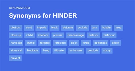 Helps, facilitates, aids, assists, opens, clears, frees, liberates On this page you'll find 195 synonyms, antonyms, and words related to hinder, such as: Contexts verb to impede the work or progress of to cause damage to to defy or put up an opposition to. Blocked, prevented, obstructed, excluded, impeded, stopped, precluded, shut out; Rear, back, hind, aft, after, posterior, dorsal, rearward; Constrain drive back entrammel forestall frustrate hamstring hold at bay intercept interfere interrupt intervene keep at bay posterior turn aside. Front, anterior, forward, frontal, fore, ventral, help, facilitate Assisting, aiding, facilitating, encouraging, promoting, abetting, smoothing, nurturing More verb to impede the work or progress of obstruct hamper impede arrest delay block check handicap Permitted, acceptable, permissible, allowable, appropriate, legal, permissive, tolerable Block, burden, crimp, curb, delay, and deter.