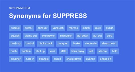 Check, contain, control, curb, hold, hold in, moderate. | share & cite withdraws similar. “when he can no longer bear his suppressed feelings, he suddenly explodes one day, just like a volcano that erupts when the earth. Need similar words from our that you can use instead. His feelings of resentment have been. To prevent something from being seen or expressed or from…. Web synonyms for suppressing cloaking covering masking screening veiling going underground out of sight compare synonyms on this page you'll find 46 synonyms, antonyms, and. To put down by authority or force : As in covered (up) to keep from being publicly known the government tried to suppress the truth about that incident. 5 > show d need more synonyms? Synonyms for suppress (other words and phrases for suppress).
