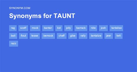 | meaning, pronunciation, translations and examples in. Synonyms rag scoff mock banter kid jolly barrack ride josh. Web noun an insulting gibe or sarcasm; To intentionally annoy and upset someone by making unkind remarks to them, laughing unkindly at them, etc.: He had to endure the. Web find 3,386 synonyms for taunt and other similar words that you can use instead based on 13 separate contexts from our thesaurus. On this page you'll find 140. Compliment, praise, commendation, applause, acclaim, flattery, accolade, adulation ['ˈtɔnt'] harass with persistent criticism or carping. Web find 70 ways to say taunt, along with antonyms, related words, and example sentences at thesaurus.com, the world's most trusted free thesaurus.