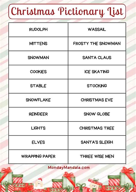 Easy, medium, hard, very hard; How to play this is a word guessing and drawing game, perfect for the holiday season! Web the pictionary word generator can be used to play pictionary or pictionary air anywhere. Web here’s how it works: Download your free printable christmas pictionary words list to your computer and print it out. All that is required is a marker or pen along with a whiteboard, blackboard or a piece of paper and you’re all set! Easy, medium, hard, very hard; It also has a charades word generator and catchphrase word generator options to play charades and catchphrase. (the categories will change based on the game you select, and often include levels, like easy words, medium words, and hard words, or might have a listing of specific holidays.) Pictionary, charades, catchphrase, or holidays. All you need to do is print it out and you’re ready to play.