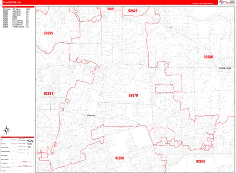 Placentia California Zip Code Wall Map (Red Line Style) by MarketMAPS